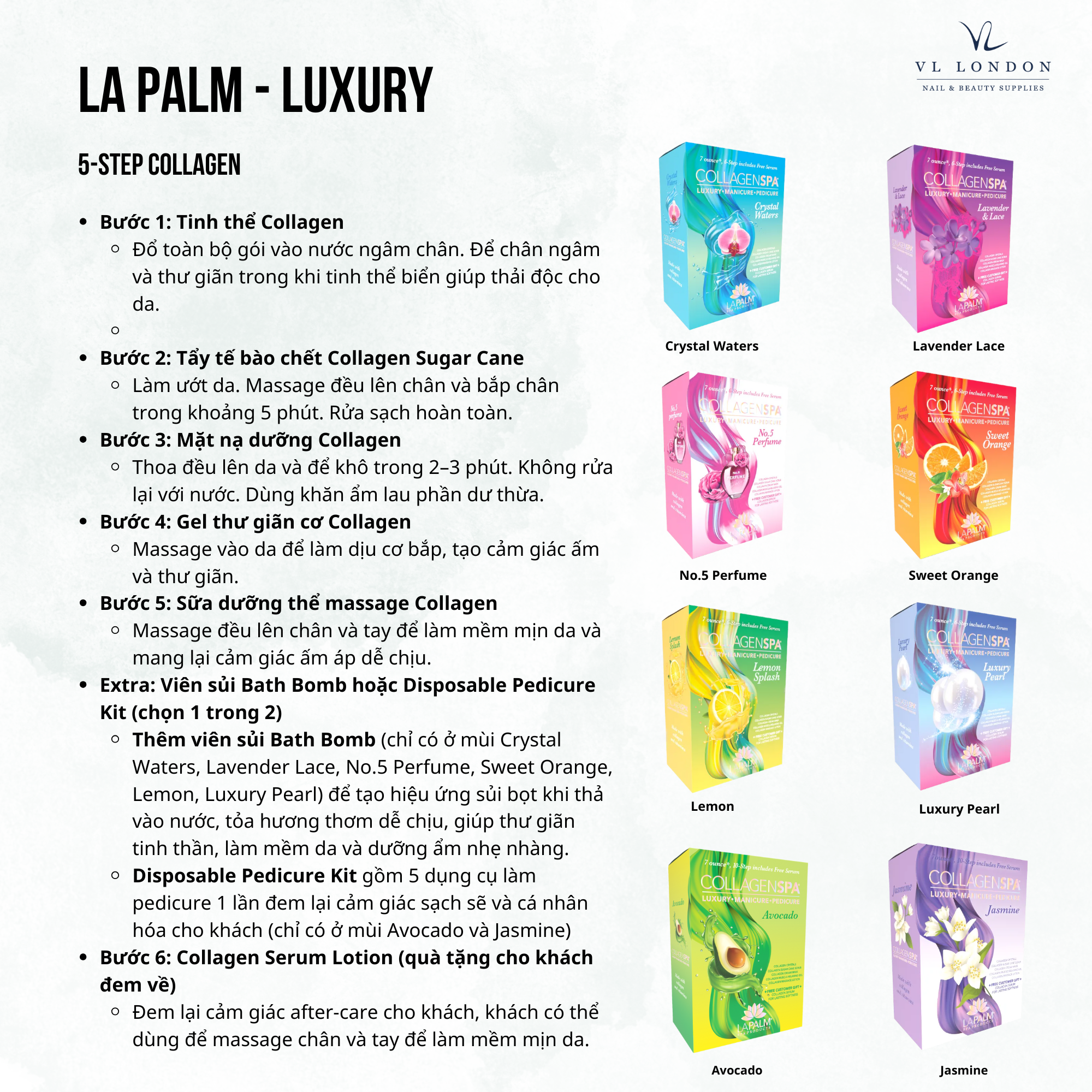 Our Collagen Spa Jasmine includes a variety of skin-nourishing products, such as Collagen Crystals, Collagen Sugar Cane Scrub, Collagen Cream Mask, Collagen Muscle-Relaxing Gel, and Collagen Massage Lotion. Each product is designed to help improve skin texture, promote elasticity, and reduce the appearance of fine lines and wrinkles.