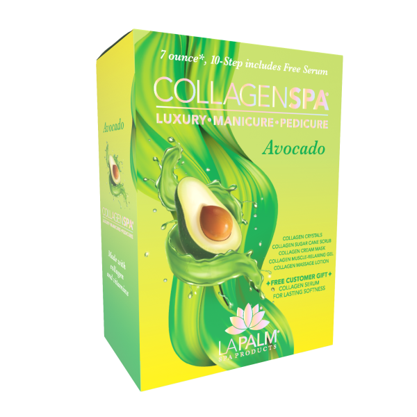 Featuring an easy-to-use ten-step system, our Collagen Spa Avocado Pedicure System includes a Foot Soak, Scrub, Mask, Relaxing Gel, Lotion and Serum Lotion Gift. Plus File, Buffer, Pusher, Toe Separator.
