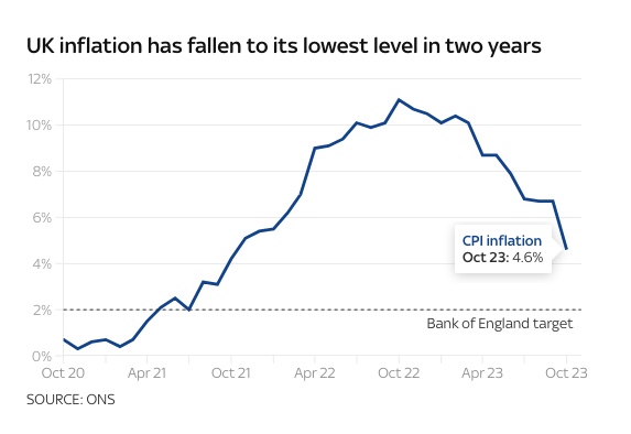 Văn phòng ONS (The Office for National Statistics) vừa thông báo lạm phát tháng 10 đã hạ xuống mức 4.6% do giá năng lượng giảm – mức thấp nhất trong 2 năm gần đây.